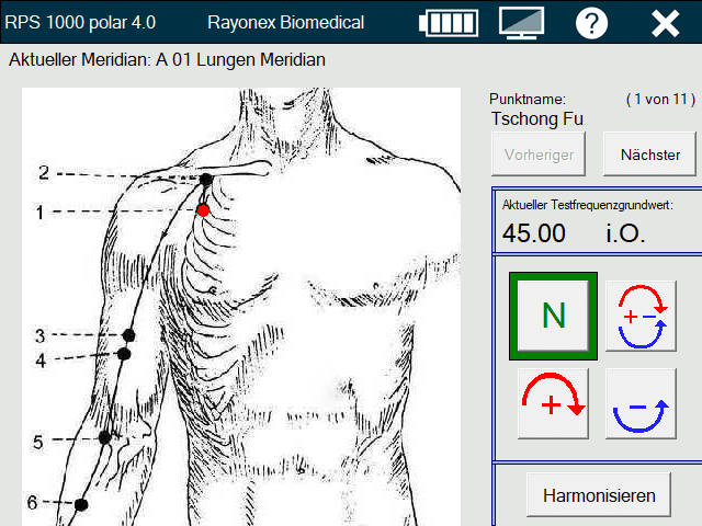Mit dem Modul der Akupunktur-Schwingungstherapie für den Rayocomp PS 1000 polar kann ein Schnelltest der Akupunkturmeridiane durchgeführt werden, auf dessen Basis dann die entsprechenden Meridianpaarungen zur Harmonisierung vorgeschlagen werden. Jeder Punkt eines Meridians kann mit Hilfe einer grafischen Darstellung untersucht und harmonisiert werden.